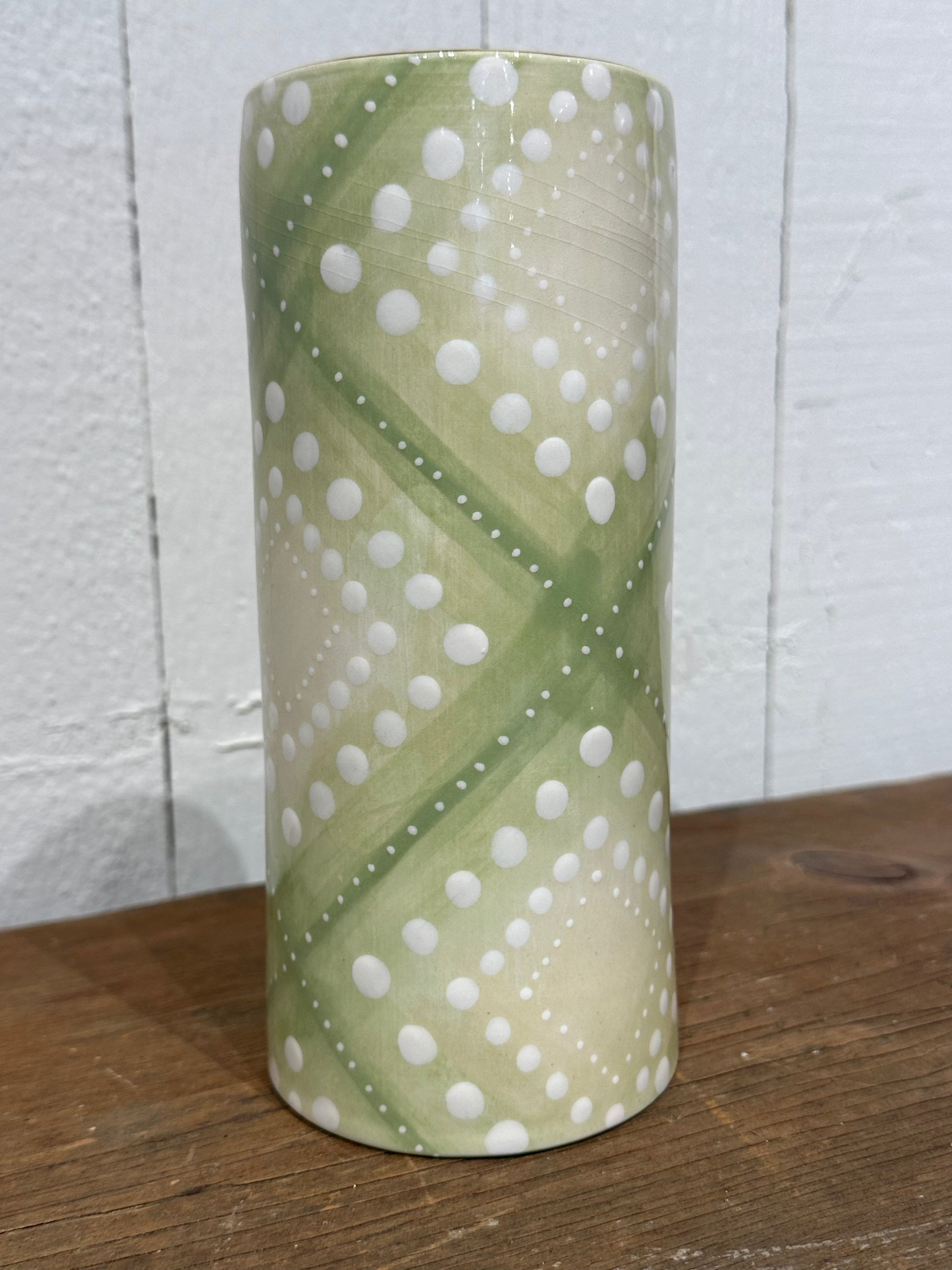 Jill's handmade #8 cylinder vase is a must have for your vase collection. With its slender profile, it is perfect for just about every flower arrangement. Inspired by the simplicity, texture and art of batiking, the Tjanting pattern is like a wrapping yourself in cozy blanket of dots, or stars in the night sky.