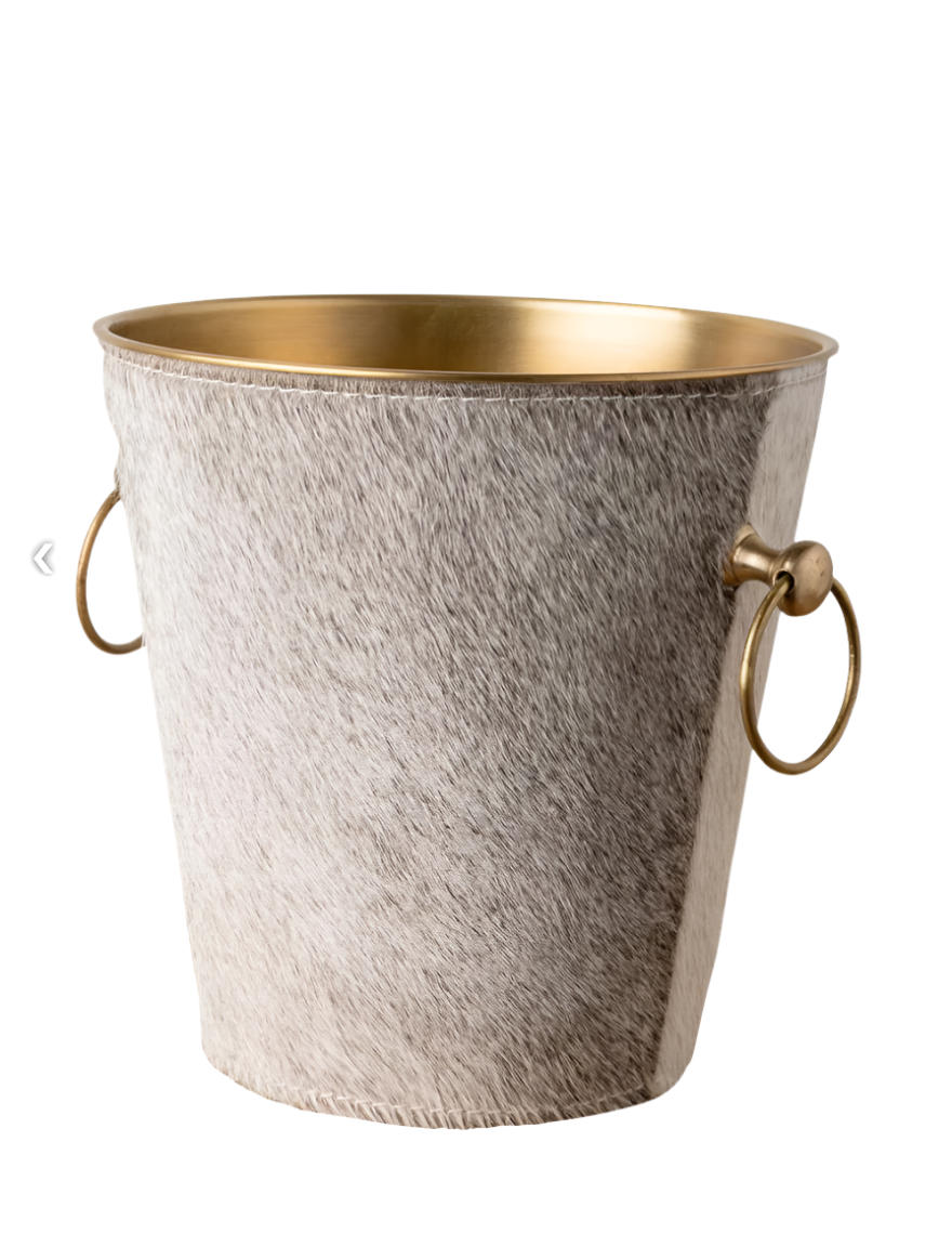 Raise a toast in style with these brass and hide-covered champagne buckets, where rustic elegance meets refined luxury. Wrapped in genuine hide and finished with gleaming brass accents, these buckets make a bold statement while keeping your bubbly perfectly chilled. The rich texture of the hide adds warmth and character, while the brass lends a timeless sophistication—perfect for entertaining or gifting. Whether for an intimate dinner or a grand celebration, these champagne buckets are a showstopping addition to any bar or table. Two sizes. Cheers to unforgettable moments!