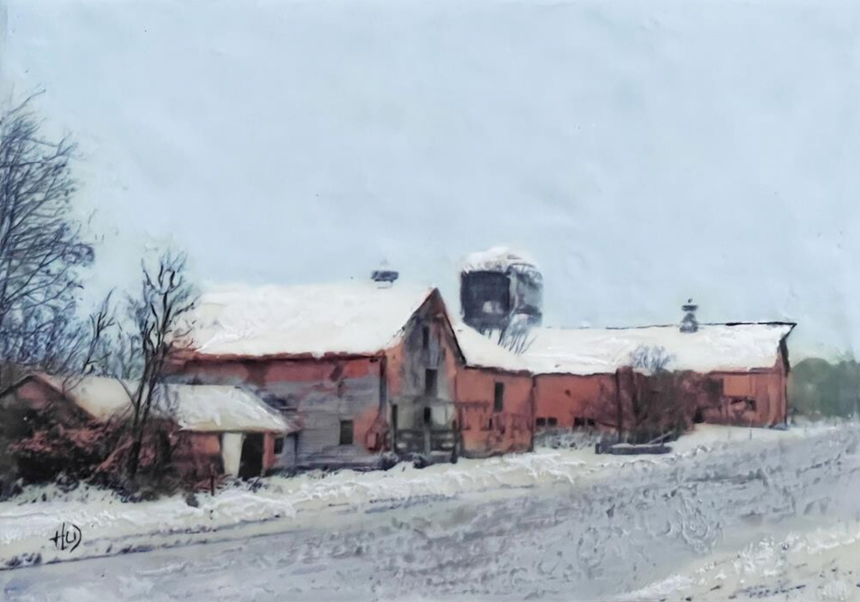It snowed overnight in Vermont and this was a scene I came upon the next morning. This encaustic incorporates a toner transfer. The encaustic paint adds texture to the snow and road.(Encaustic is a process in which you paint with melted wax, fusing each layer together. When polished it gives a luminescence not seen in other mediums.)