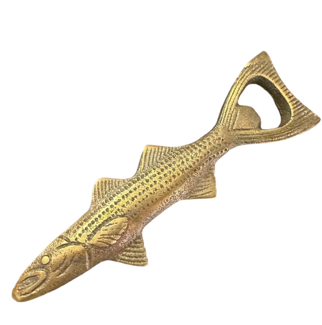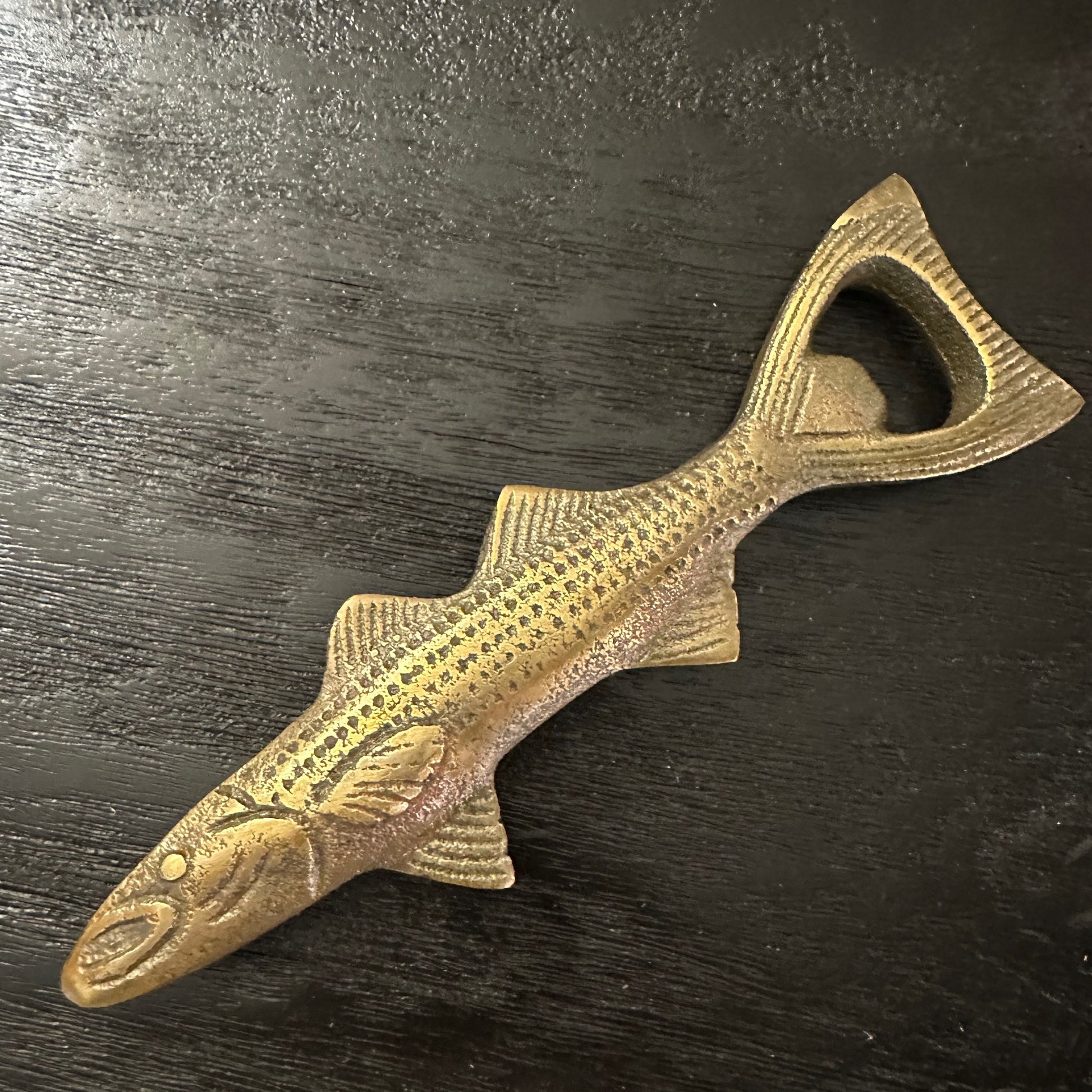 A burnished brass colored bottle opener in the form of a fresh water fish. A necessary tool for any fisherman, this bottle opening tool is as functional as it is handsomely designed. Made of cast aluminum in a antique gold finish.