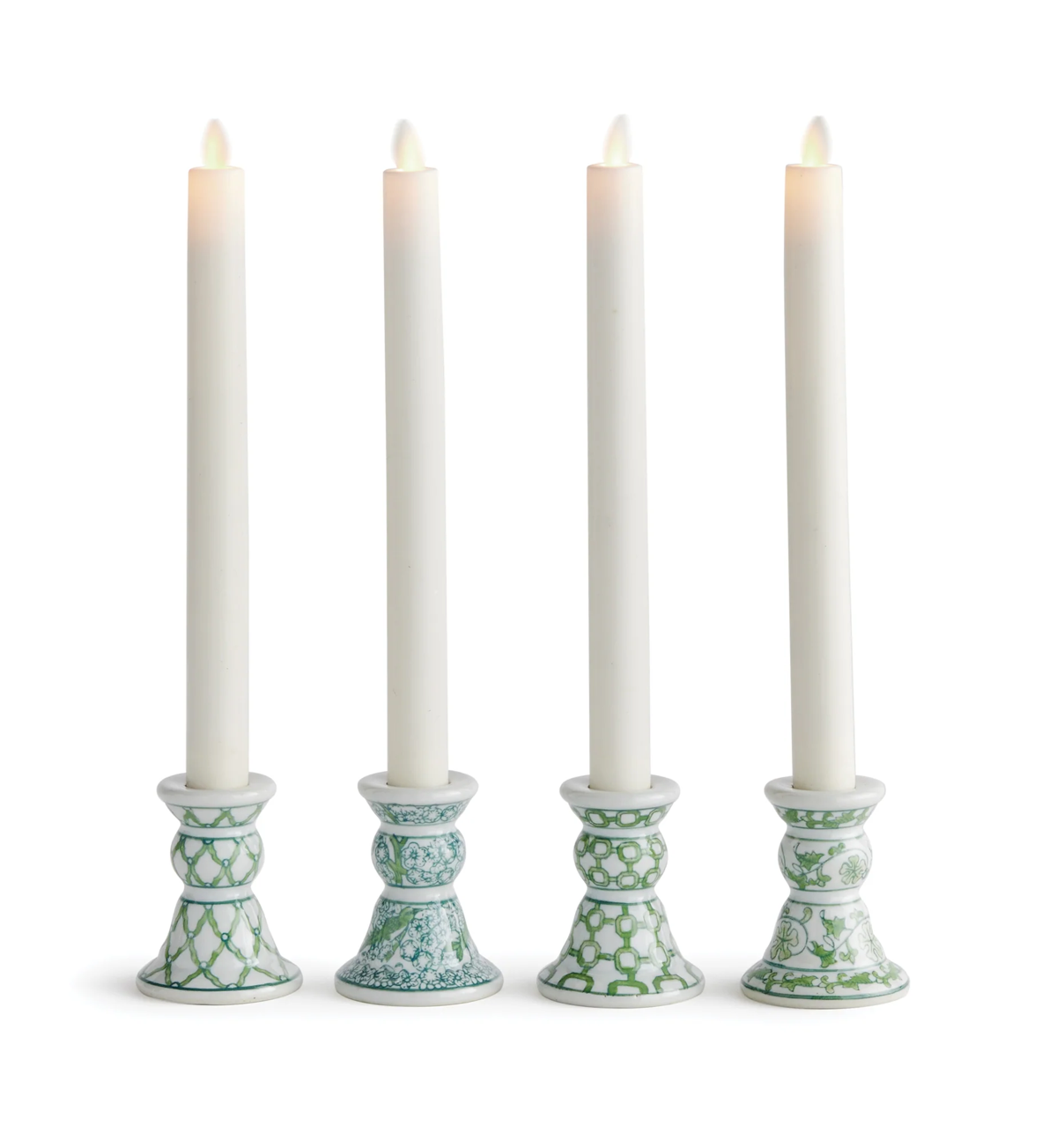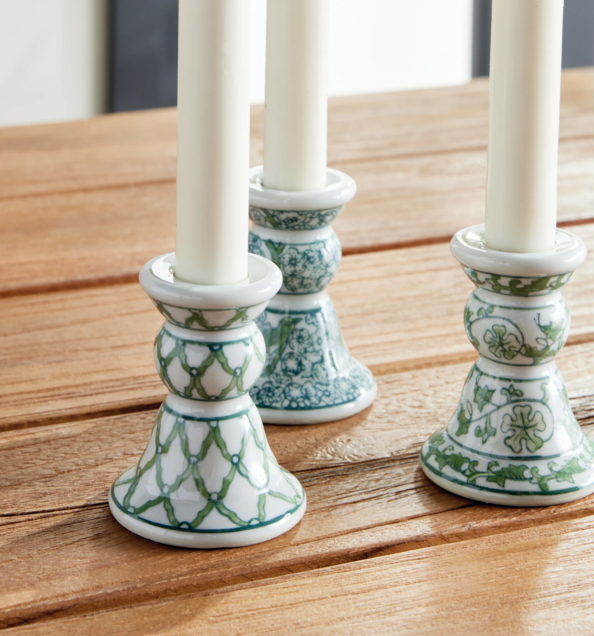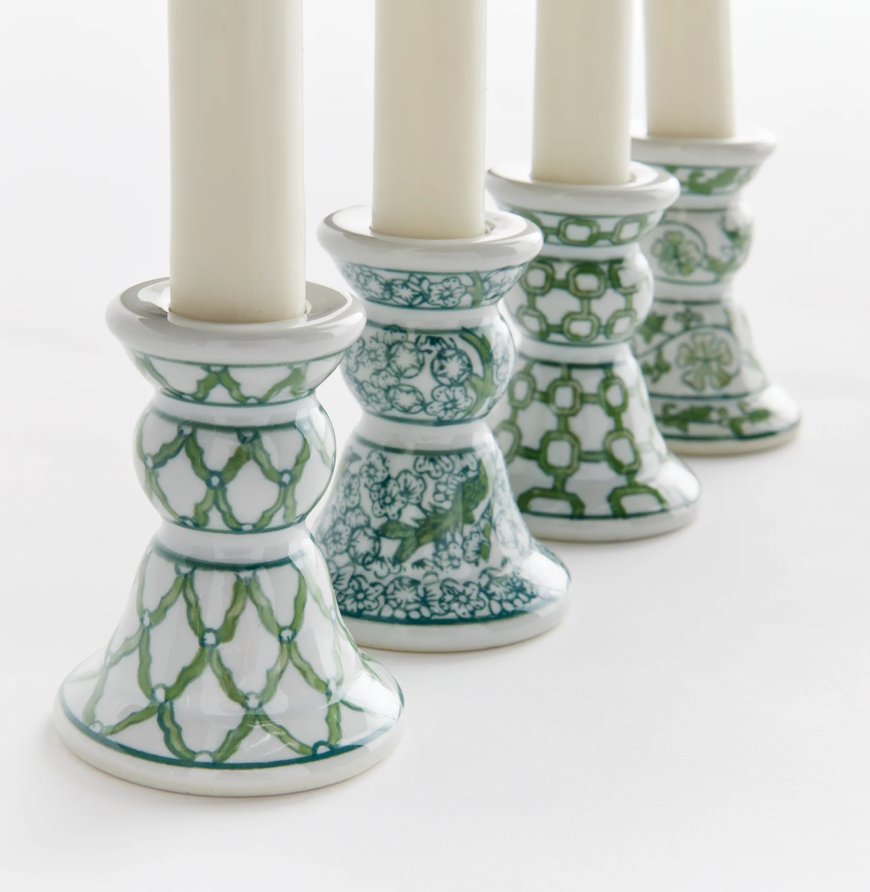 A classic chinoiserie in shades of green & white. How refreshing! The color green is known to have a harmonizing, balancing effect, and is an inspired design choice for these coordinating mini taper holders. A welcome addition, adding stability and calm to the well-appointed bookshelf, mantel or entry console.
