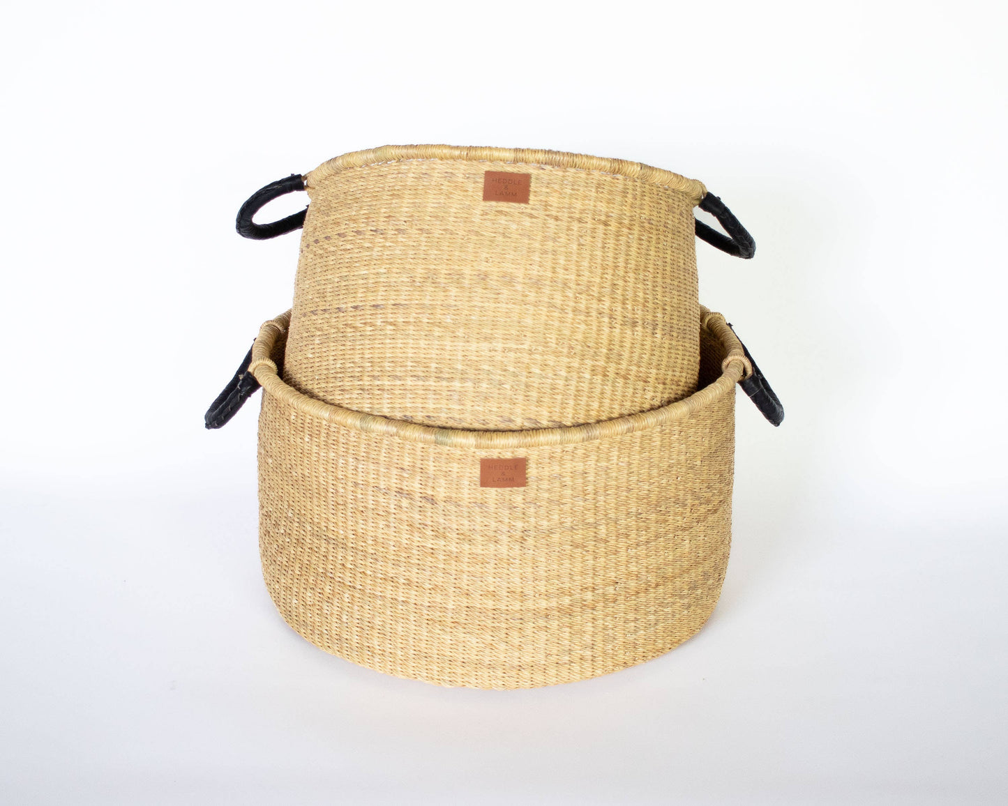 Short hamper with Leather handles. Designed and hand woven in northern Ghana in the Bolgatanga Region by traditional basket weavers, these baskets are sure to spruce up any space. Great for toys, blankets, holding your laundry or shoes.