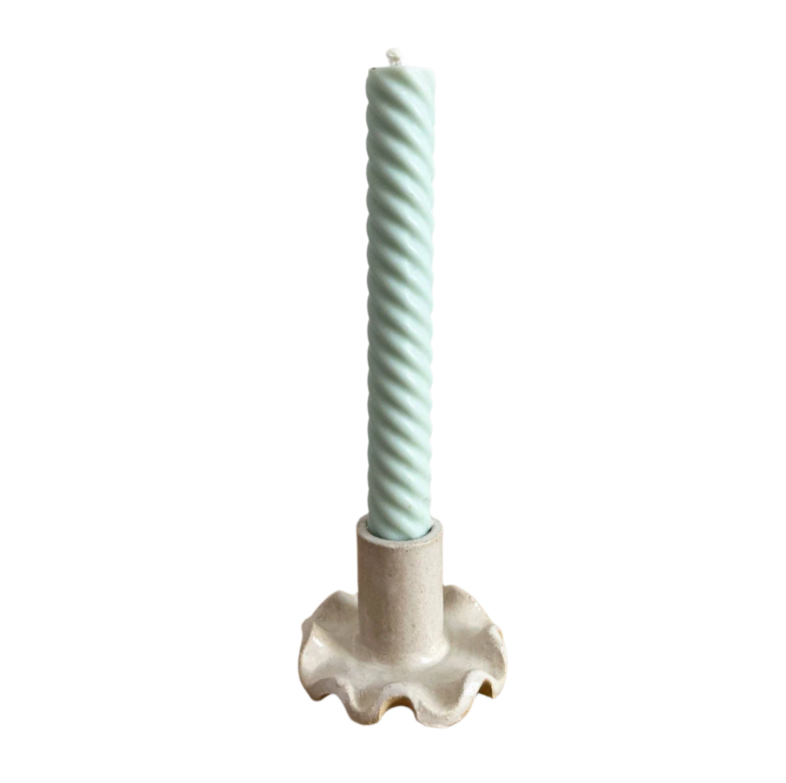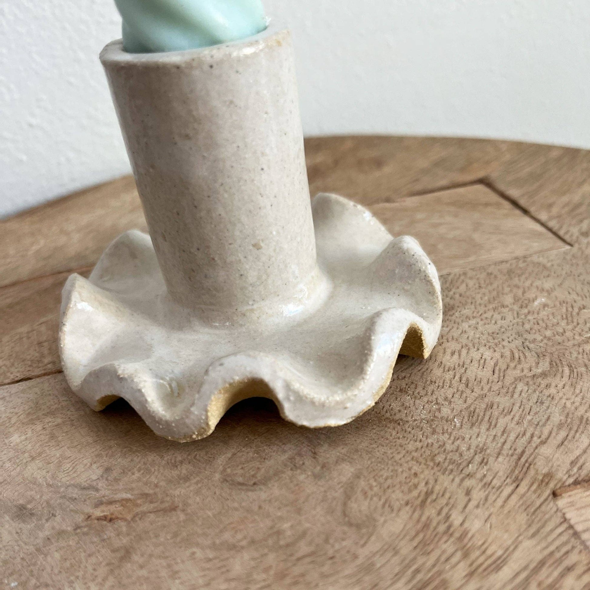 Sweet little ceramic candle holders with a ruffled base. Taper candles come in a lot of different sizes, a fatter taper candle will fit best in these. Each one is unique.
