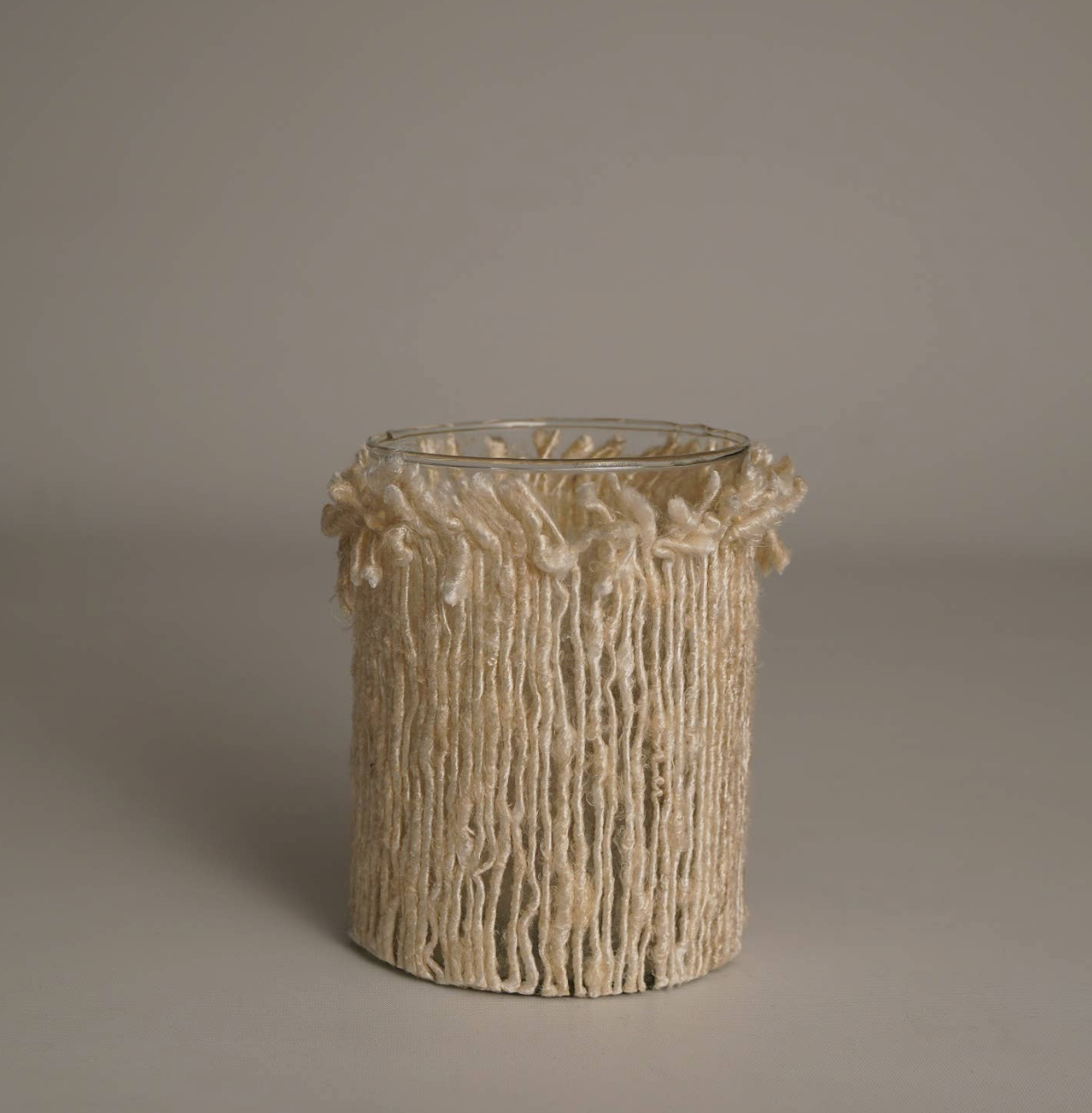 Bring warmth and texture to your space with this understated yet elegant wrapped hurricane votive. Wrapped in soft, cream-hued string that’s artfully applied to a glass base, it creates a beautifully tactile look while gently diffusing candlelight for a cozy, ambient glow.